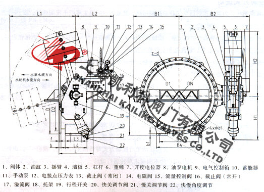 1、本閥由閥門(mén)本體、傳動(dòng)機(jī)構(gòu)、液壓站、電控箱等四部分組成。
